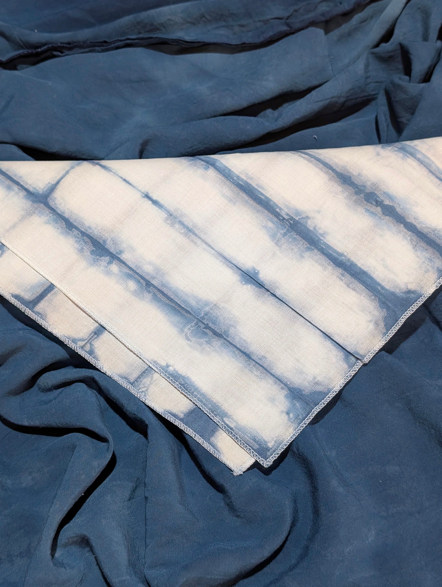 Inspired by traditional shibori techniques, each bandana is folded and rubber banded to reveal a striped pattern once dipped in the dye vat. Pattern style and dye intensity are varied. Your napkin set is unique and will not look exactly like the product photos....but will be pretty darn close.