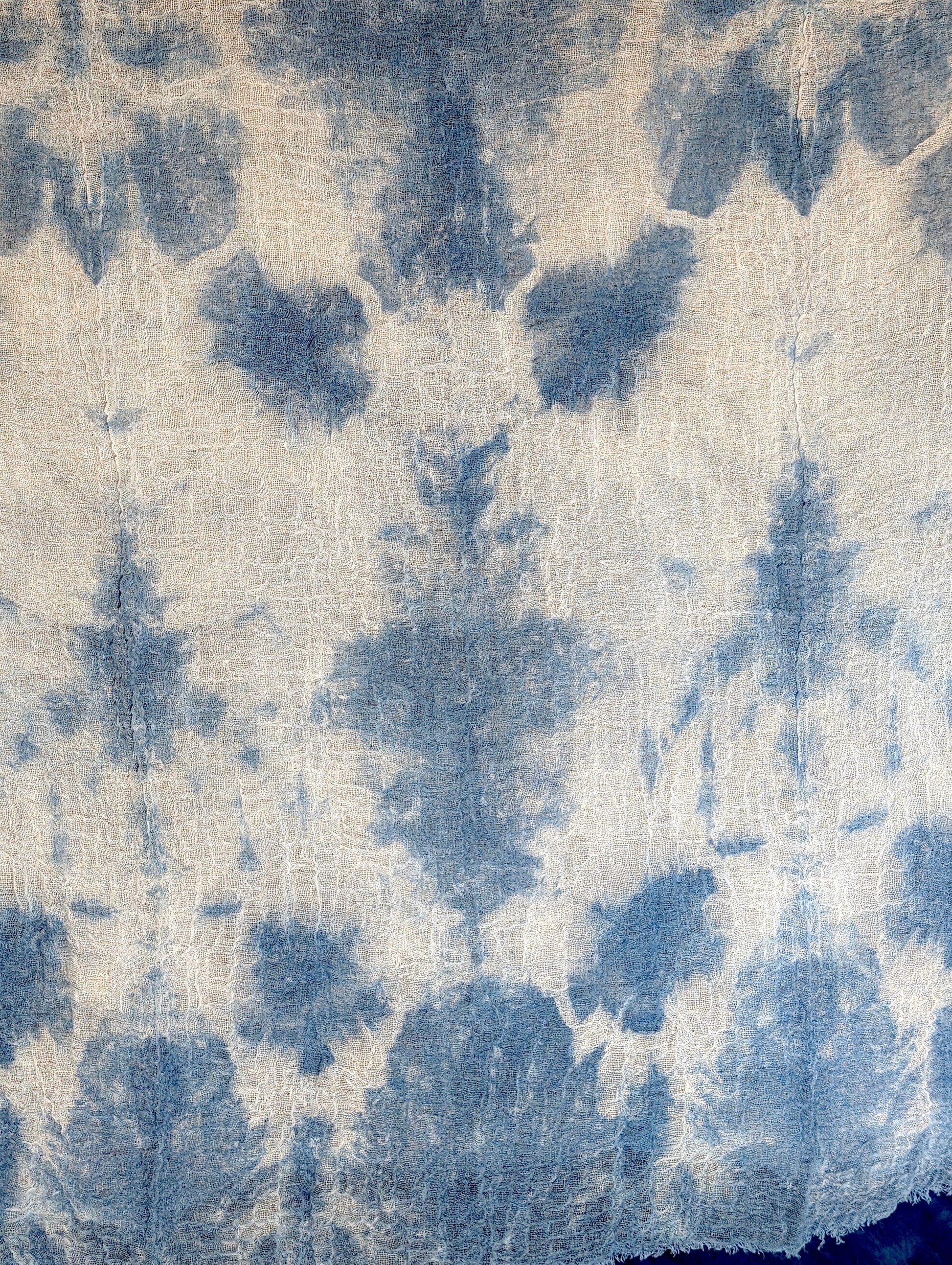 Hand-dyed by Natalie Menacho on Orcas Island, Washington using a "Sugar Vat" consisting of organic indigo, fructose, and slaked lime. These are all-natural inputs and the rinse water safely finds it's way into my yard. I've been growing indigo since 2024. Some of the organic indigo used to dye this item was grown on-island!
